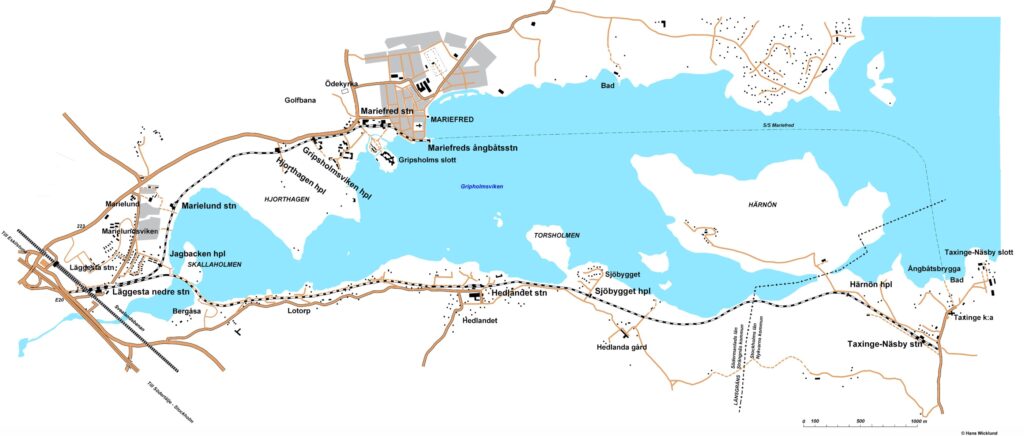 ÖSlJ Linjekarta. Räknat från Mariefreds ångbåtsstation: Mariefreds ångbåtsstation, anslutning till S/S Mariefred. Värdshuset. Mariefred, större station med biljettlucka och toalett. Gripsholmsviken. Hjorthagen. Marielund. Jagbacken. Läggesta Nedre, större station med biljettlucka och toalett, samt Mälartågs station Läggesta 350 meter bort. Hedlandet. Sjöbygget. Härnön. Taxinge-Näsby, större station med biljettlucka och toalett. Anslutning till S/S Mariefred 750 meter bort.
